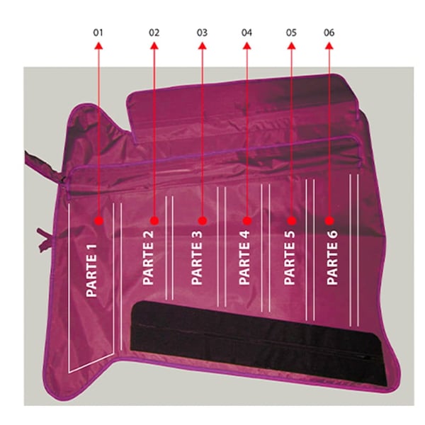 A particularidad do kit de Pressomass é a disposição dos setores a espinha de peixe, esta conformação evita deixar espaços durante o inflado e evita o reflujo circulatorio.