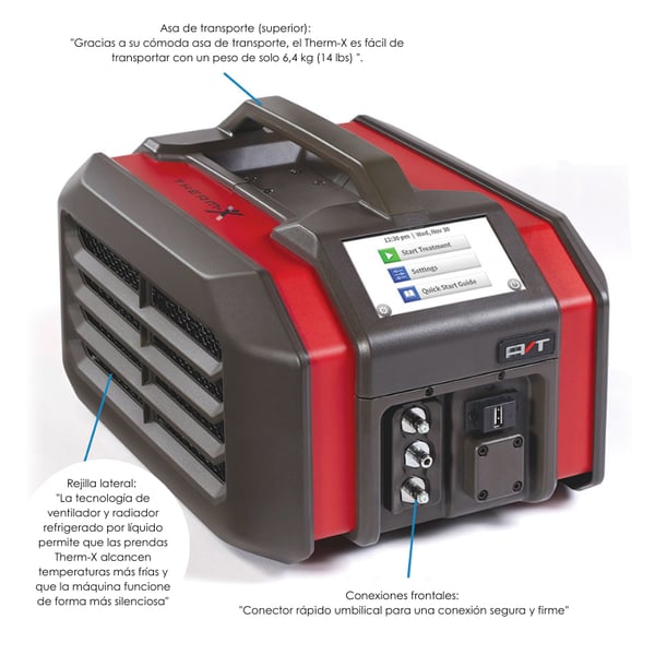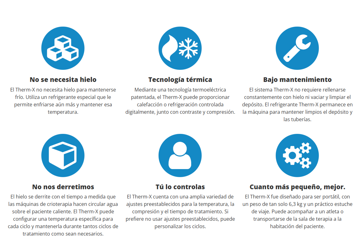 Therm-X ??AT combina terapia de frio, calor, contraste e compressão. Está indicado para tratar lesões agudas e postoperatorias, reduzindo o edema, a hinchazón e a dor para os que se recomenda a aplicação de frio e compressão. Também está indicado para tratar afeções médicas e/ou cirúrgicas postraumáticas e postoperatorias nas que se requer terapia térmica localizada (frio ou calor).