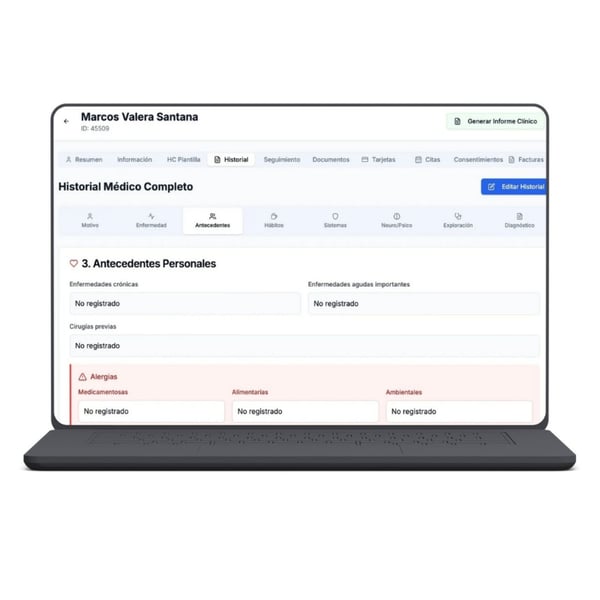 Historiais clínicos digitais acessíveis desde qualquer dispositivo.
