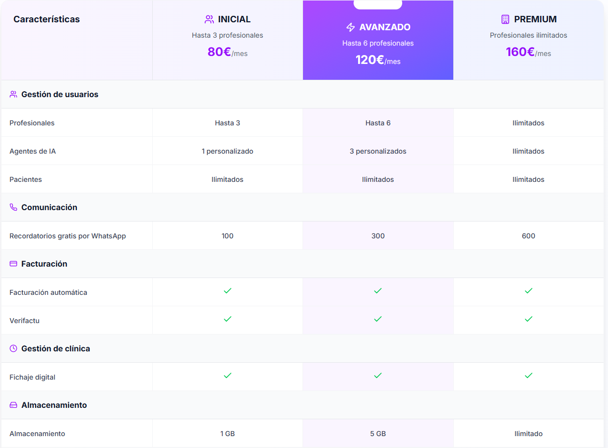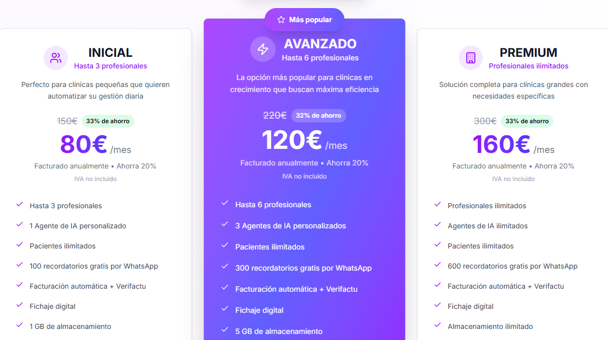 Ideal para clínicas pequenas (até 3 profissionais) que querem digitalizar a sua gestão e começar a usar IA em tarefas básicas.