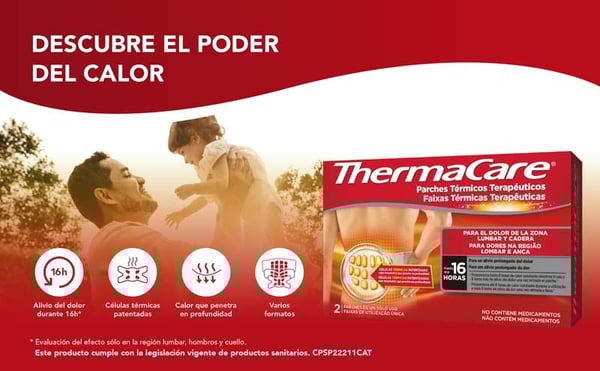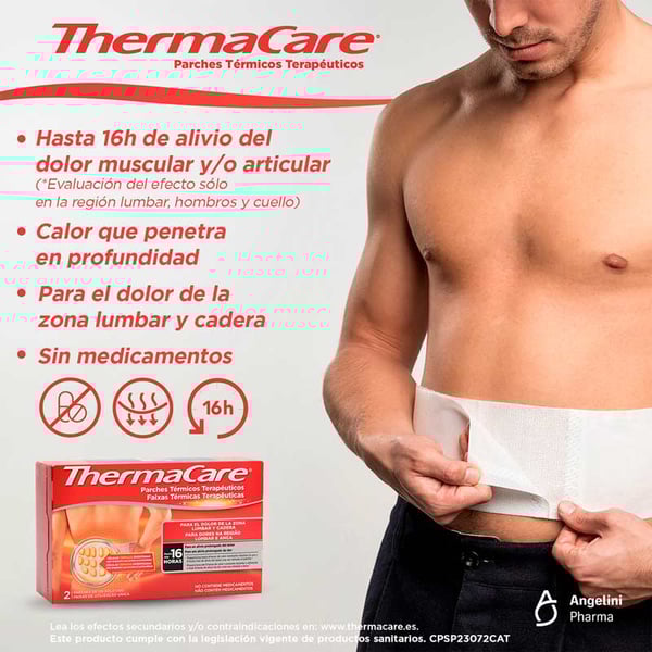 A cada célula térmica contém ferro (aproximadamente 2 gramas). Se o ferro é ingerido consulte imediatamente ao seu médico. Se o ferro entra em contacto com a pele ou os olhos, retire o parche, esclareça com água a zona afetada e consulte imediatamente ao seu médico. Nunca quente o produto no microondas nem tente recalentarlo por outros meios, já que o parche poderia se incendiar. Os produtos que emitem calor podem causar queimaduras. Verifique periodicamente a pele enquanto use ThermaCare. Em caso de detetar signos de irritação ou quemazón, retire imediatamente o produto. Se notasse demasiado quente o parche, deixe de utilizá-lo ou retire do contacto direto com a pele, colocando sobre uma capa de roupa. Para verificar a sua sensibilidade ao calor, a primeira aplicação do parche deve ser durante o dia, enquanto esteja acordo. O risco de sofrer queimaduras aumenta com a idade. Se tem 55 anos ou mais, não utilize ThermaCare enquanto dorme. Não exerça pressão adicional sobre o produto (p.ex. se apoiando sobre superfícies duras, o utilizando embaixo de roupa cingida ou com um cinto muito apertado). Não o utilize mais de 8 horas em um período de 24 horas. Interrompa o uso do produto e consulte com o seu médico: Se nota na zona de aplicação de ThermaCare moléstias, quemazón, hinchazón, exantema ou outras mudanças cutáneos persistentes na pele. Se após 7 dias de uso a dor persiste ou agrava-se. Manter fosse do alcance das crianças e animais domésticos. Não utilizar se observa células térmicas com perda de conteúdo e/ou o parche está danado ou rasgado. Um só uso. Não contém medicamentos