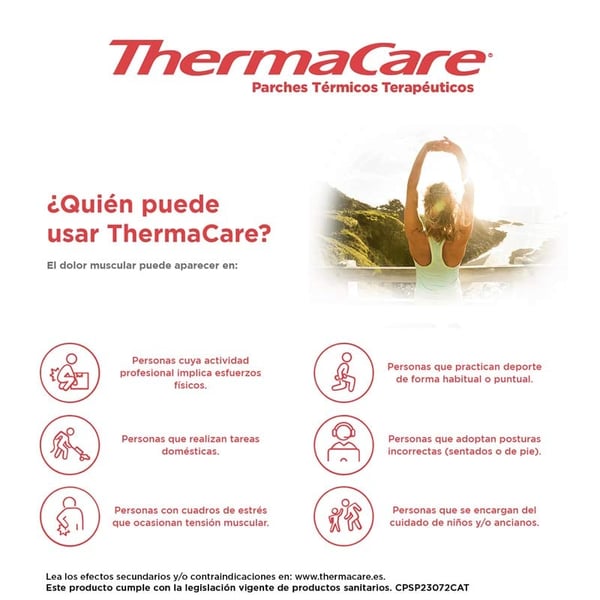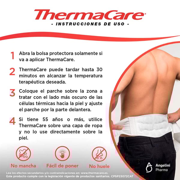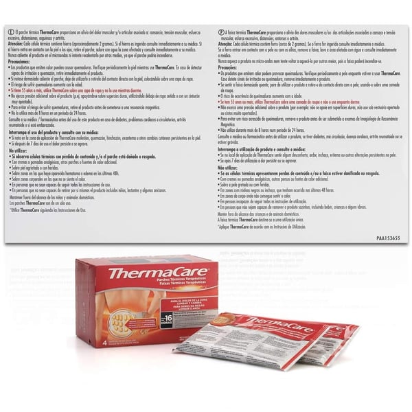 A cada célula térmica contém ferro (aproximadamente 2 gramas). Se o ferro é ingerido consulte imediatamente ao seu médico. Se o ferro entra em contacto com a pele ou os olhos, retire o parche, esclareça com água a zona afetada e consulte imediatamente ao seu médico. Nunca quente o produto no microondas nem tente recalentarlo por outros meios, já que o parche poderia se incendiar. Os produtos que emitem calor podem causar queimaduras. Verifique periodicamente a pele enquanto use ThermaCare. Em caso de detetar signos de irritação ou quemazón, retire imediatamente o produto. Se notasse demasiado quente o parche, deixe de utilizá-lo ou retire do contacto direto com a pele, colocando sobre uma capa de roupa. Para verificar a sua sensibilidade ao calor, a primeira aplicação do parche deve ser durante o dia, enquanto esteja acordo. O risco de sofrer queimaduras aumenta com a idade. Se tem 55 anos ou mais, não utilize ThermaCare enquanto dorme. Não exerça pressão adicional sobre o produto (p.ex. se apoiando sobre superfícies duras, o utilizando embaixo de roupa cingida ou com um cinto muito apertado). Não o utilize mais de 8 horas em um período de 24 horas. Interrompa o uso do produto e consulte com o seu médico: Se nota na zona de aplicação de ThermaCare moléstias, quemazón, hinchazón, exantema ou outras mudanças cutáneos persistentes na pele. Se após 7 dias de uso a dor persiste ou agrava-se. Manter fosse do alcance das crianças e animais domésticos. Não utilizar se observa células térmicas com perda de conteúdo e/ou o parche está danado ou rasgado. Um só uso. Não contém medicamentos