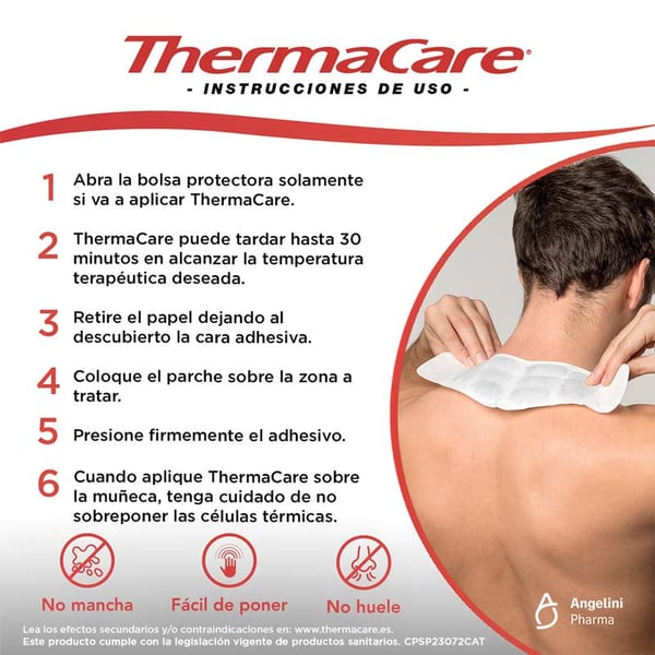 - FÁCIL DE USAR. Os parches térmicos aquecem-se sós uns minutos após abrir a embalagem. Coloque o parche sobre a zona a tratar. Pressione firmemente o adesivo. Quando aplique ThermaCare sobre a boneca, tenha cuidado de não sobreponer as células térmicas. Não deixa resíduos de adesivos. Não é necessário ativar os parches
