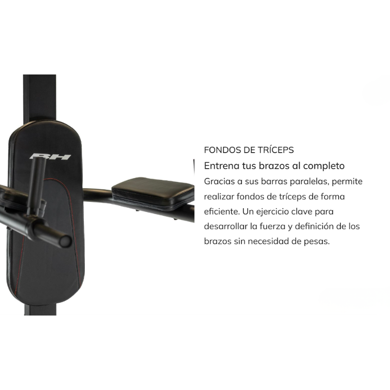 A Power Tower G340 é uma multiestación de treinamento com peso corporal desenhada para realizar rotinas completas de força em casa. Permite trabalhar principalmente costas, abdominais, tríceps e pectorales mediante dominadas, elevações de pernas, fundos e flexões assistidas ou com suporte. BH apresenta-a como uma solução robusta para treinamento funcional doméstico, orientada a utentes que procuram versatilidad sem necessidade de pesas ou máquinas complexas.