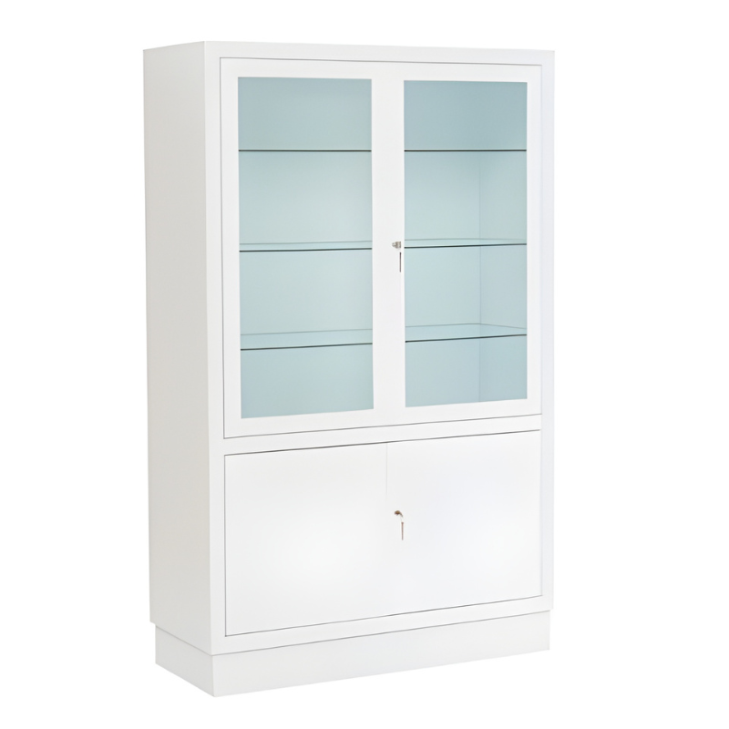 A sua estrutura robusta e funcional integra uma secção superior com portas de cristal que permitem a visualização do conteúdo, e uma secção inferior fechada que proporciona resguardo adicional para insumos ou equipas.